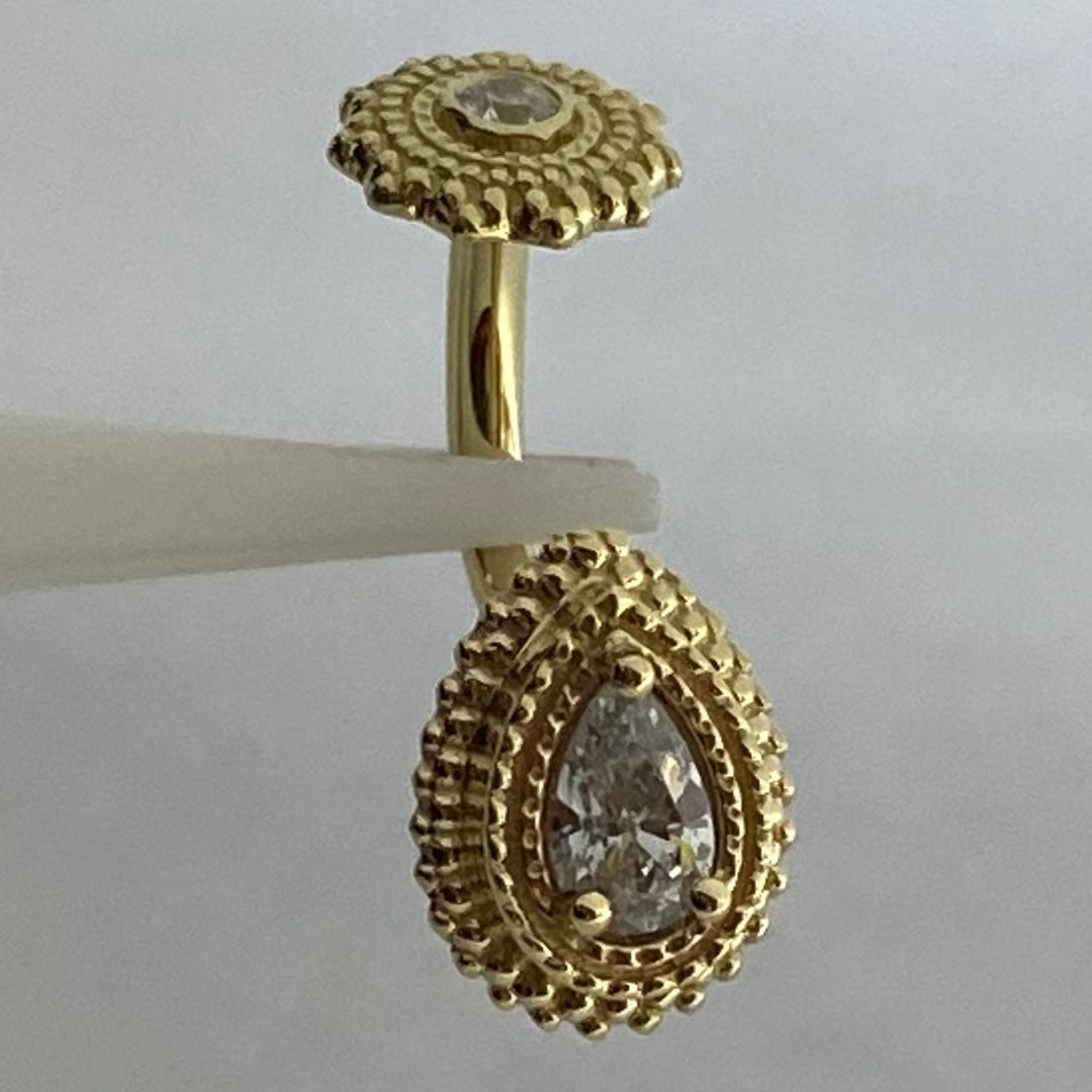 Incredibly stunning j-curve shaped barbell with a 8x6mm Afghan Pear bottom and 6mm round Afghan top. Intricately detailed plating featuring gorgeous gemstones
