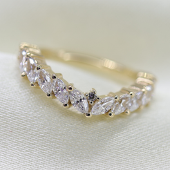 A row of glittering brilliant cut marquise gemstones angled to come together at a point in the middle with delicate r...