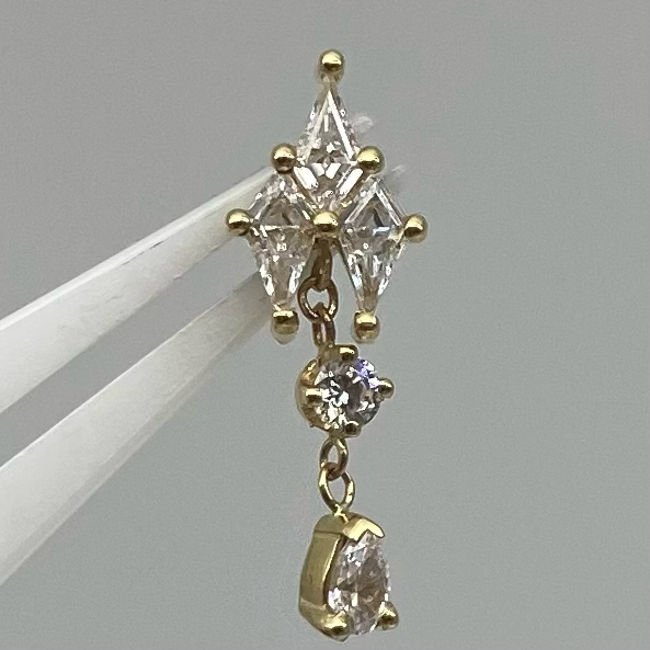 This stunning piece features a cluster of kite cut gemstones accented with a brilliant and pear shaped gemstone dangle, this piece is truly show stopping. It would be a perfect feature for a flat, faux rook or earlobe piercing.