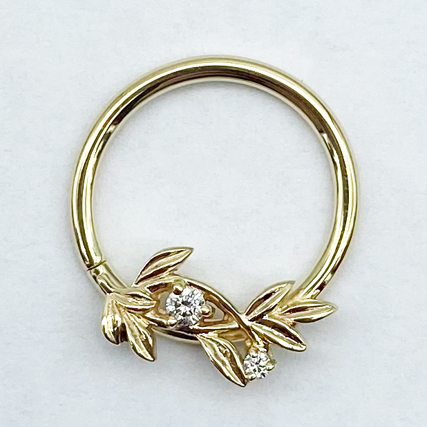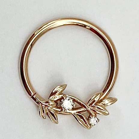 This ring features an elegant vine entwined around it, featuring delicate details and tiny gemstones. This piece would be perfect in a daith piercing.