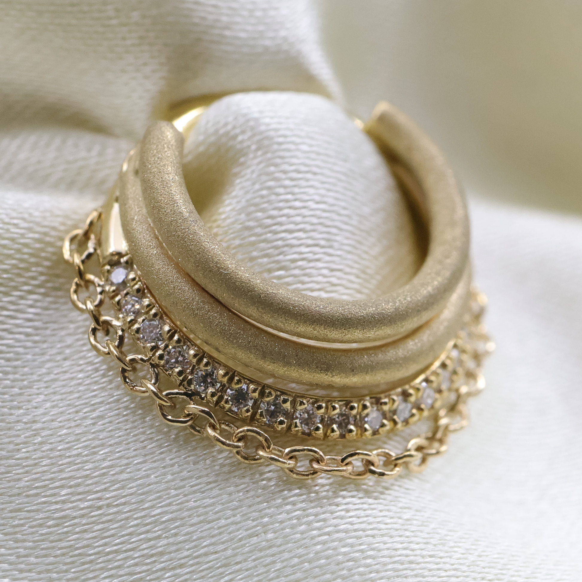 Featuring three graduating rings, two with sandblasting and one adorned with delicate 0.8mm diamonds all tied together with a cable chain hanging slightly below the last ring. This statement piece would look stunning in a septum.