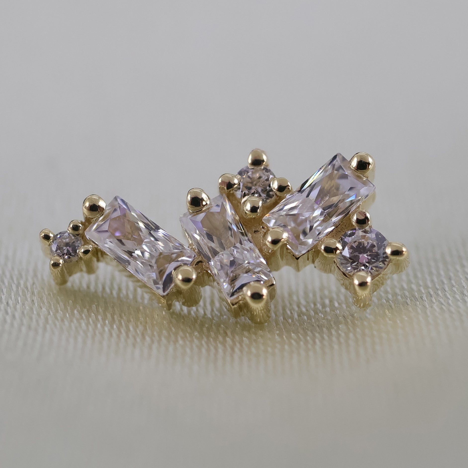 Tiny baguette and brilliant cut gemstones stacked together to create this incredible cluster. A delicate statement piece perfect to adorn your helix or earlobe.