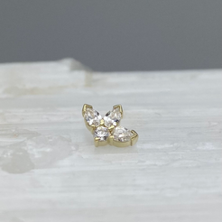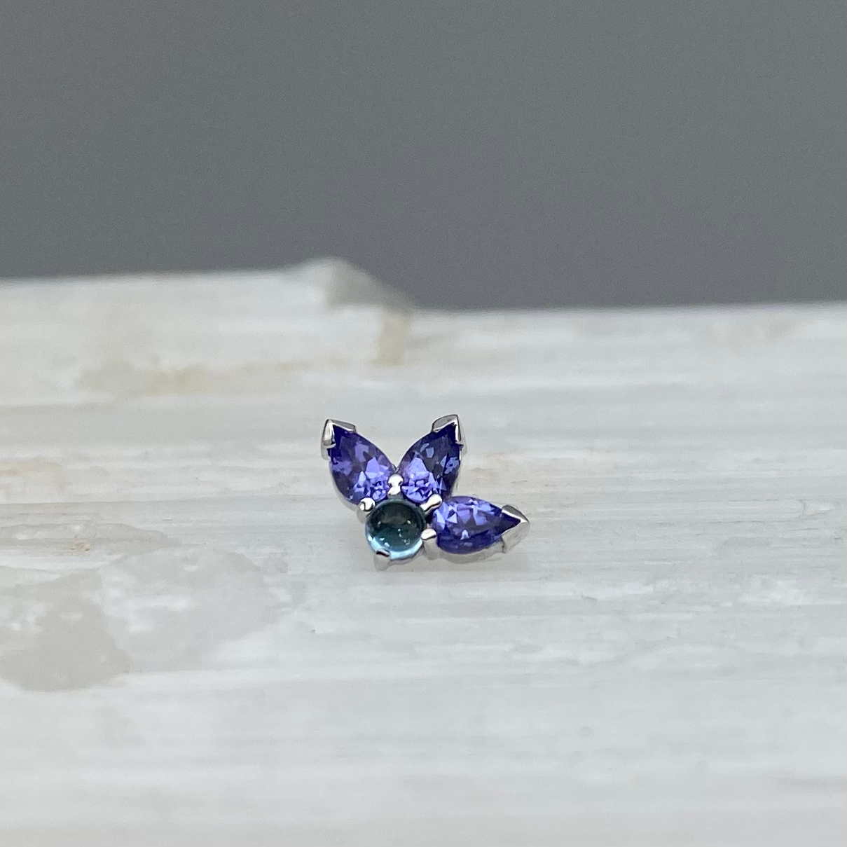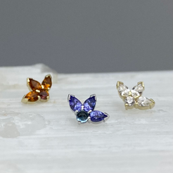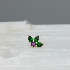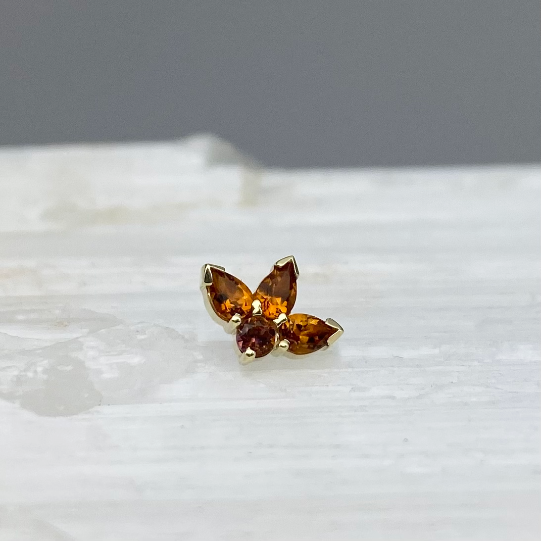 Three gorgeous pear cut gemstones with a round gemstone nestled at the bottom to compliment the fan above. These look incredible helix and conch and faux rook piercings.