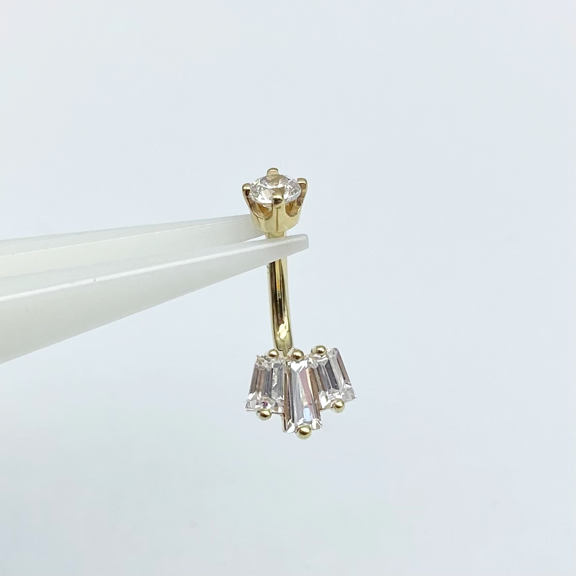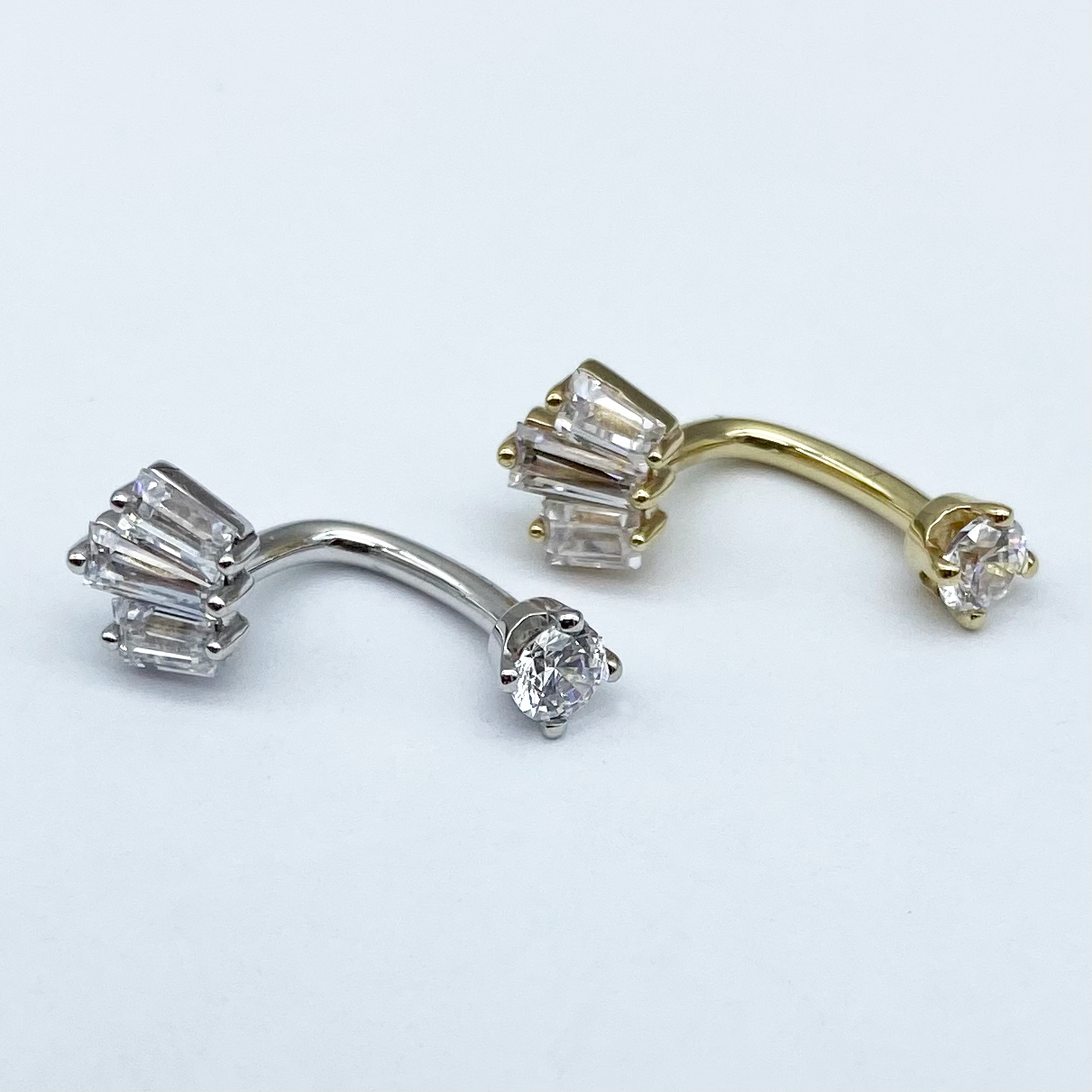 A stunning cluster of three different sized tapered baguette cut gemstones arranged in a subtle arc shape, nested at the bottom of this regal j-curve style barbell. With a 3mm gemstone on top this is the perfect piece to crown your rook piercing.
