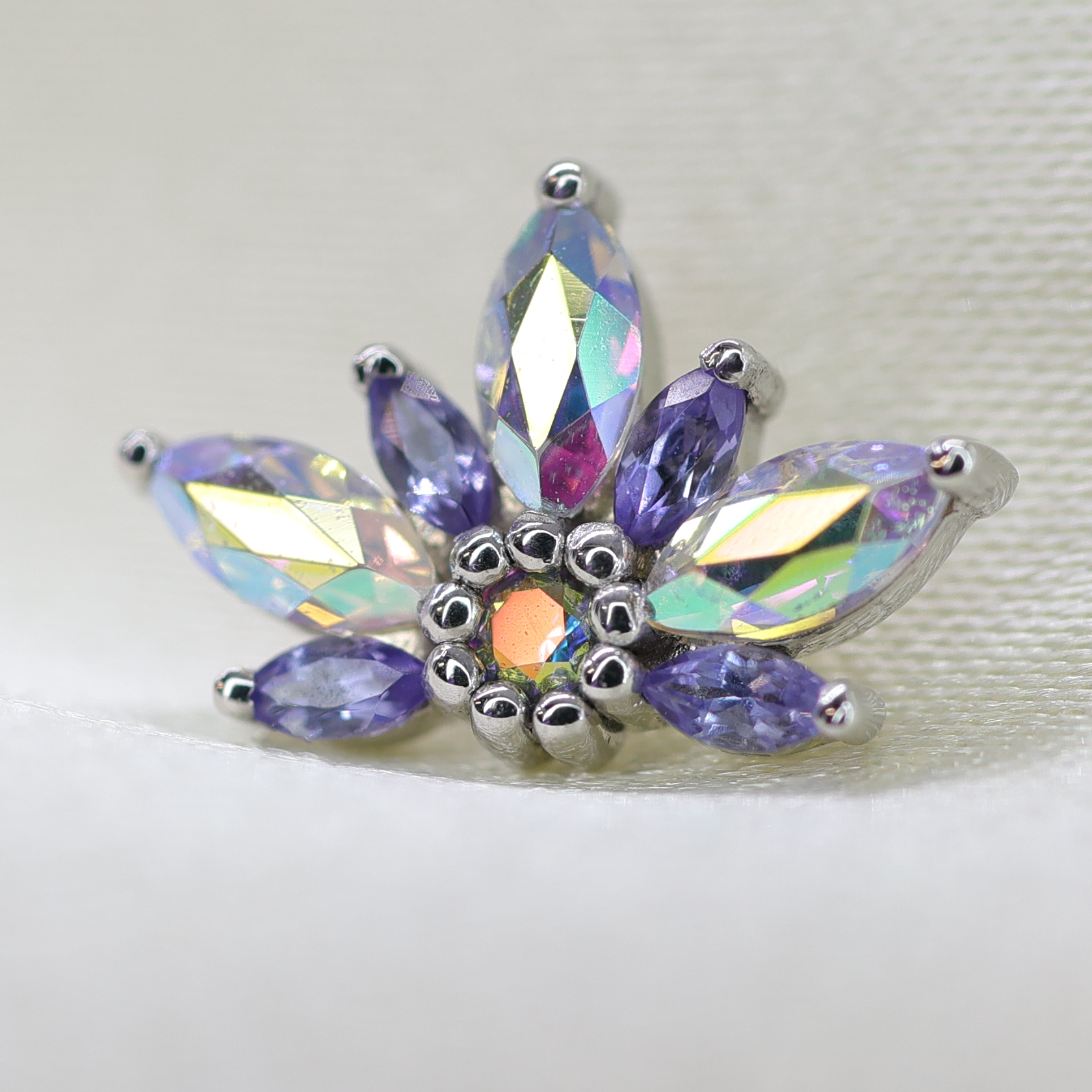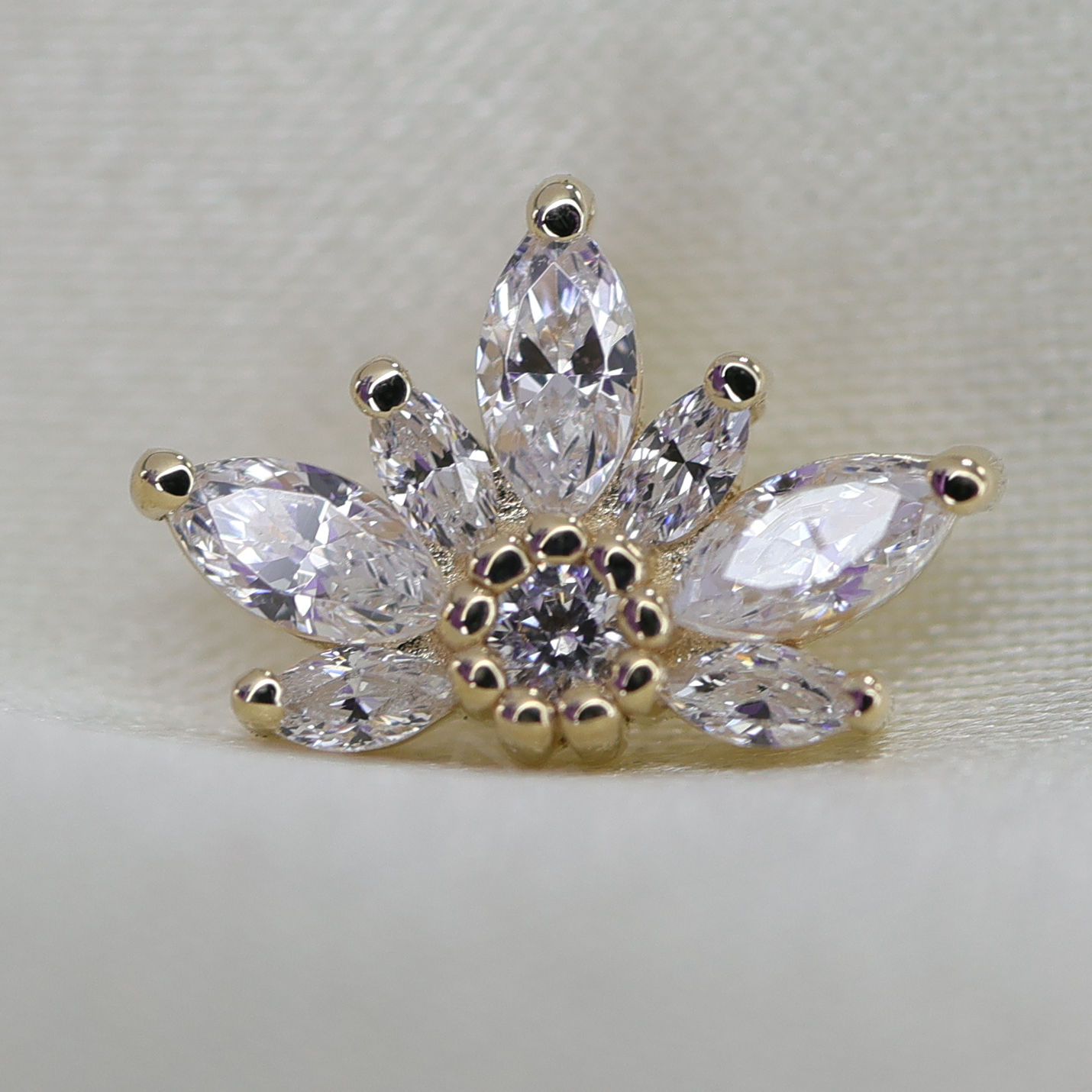 Stunning arrangement marquise cut gemstones framing a delicate round prong centre with tiny beaded details. This piece would work best in a conch piercing.