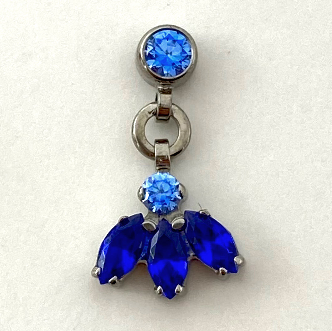 Specifications Gauge: Universal 18g, 16g, 14g, 12g Material: Implant grade titanium ASTM F136 Ti6Al4V ELI Gemstone: Swarovski cubic zirconia, dark blue & fancy blue Style: Threadless (push fit) end to fit internally threadless barbell
