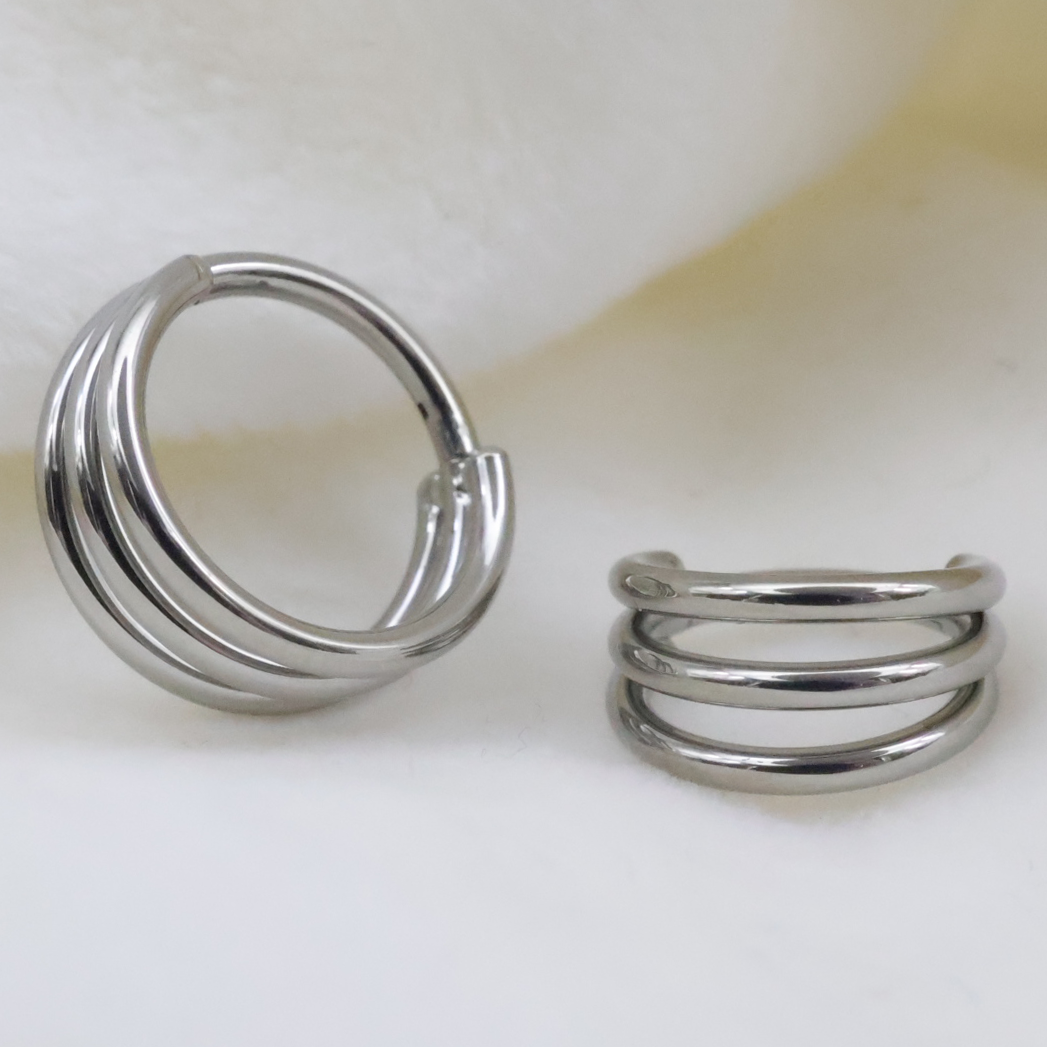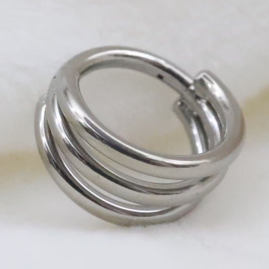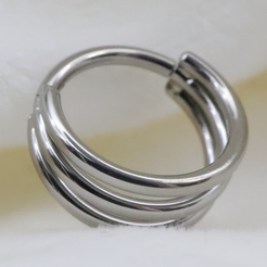 Get the look of wearing multiple rings with these neat, stacked clickers with a flare between each ring. Looks like three rings, but it's only one!